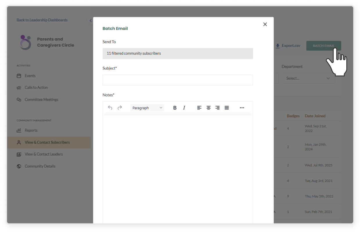 - Click the green Batch Email button and compose your message, including a subject line, body text, and attachments as relevant