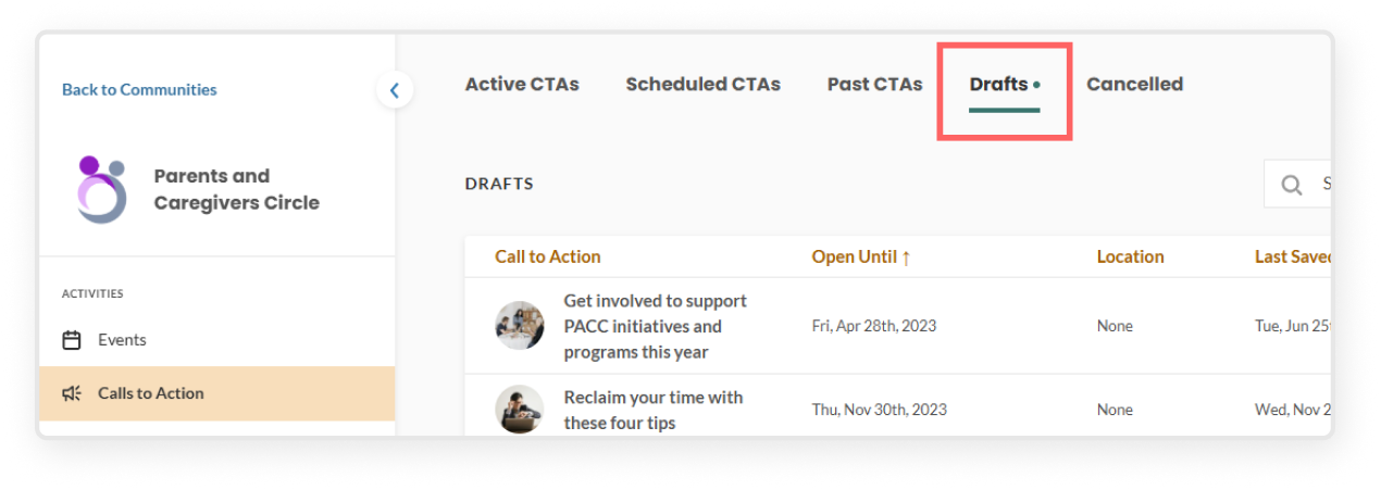 Select the community and click Calls to Action on the left sidebar